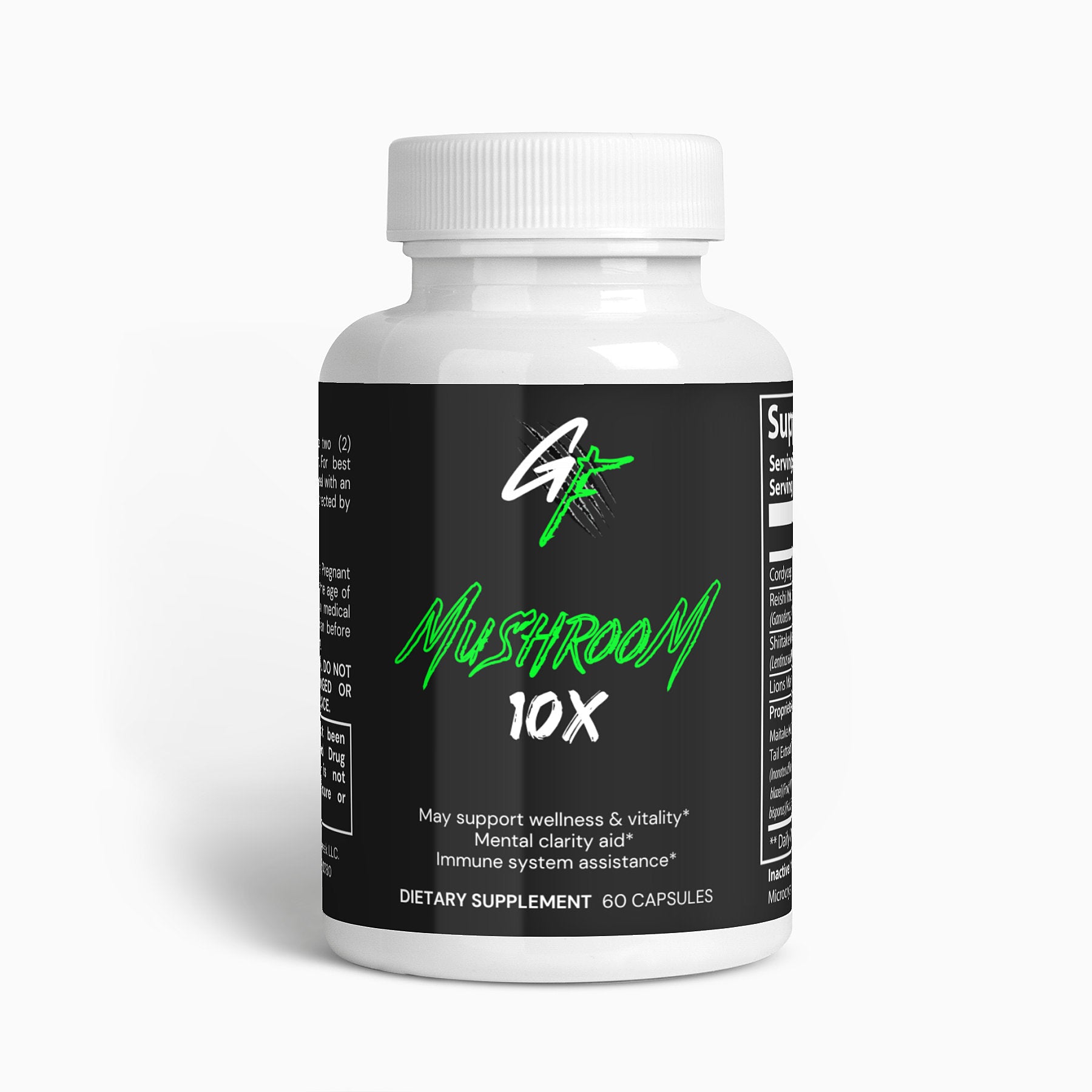Ingredients: Cordyceps Sinensis Powder, Reishi Mushroom Extract, Shiitake Mushroom Extract, Lions Mane, Proprietary Blend (Maitake Mushroom Extract, Turkey Tail Extract, Chaga Mushroom Extract, Royal Sun Agaricus Extract, White Button Mushroom Extract, Black Fungus Extract, Cellulose (Vegetable Capsule), Microcrystalline Cellulose, Magnesium Stearate.